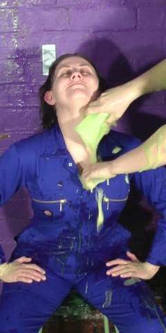 We thought it would be fun to do a split screen of Sabrina during her shoot. You will have the viewing pleasure of seeing her reduced to a human blob on the right and her all clean and happy on the left as a reference of what she once looked like. We don't hold back as she is pied and slimed non stop. She then gets on the floor and plays in the mess and dunks her head in a bucket of slop.