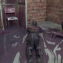 Both get totally covered before rolling around in the gunge on the floor and then washing each other off.