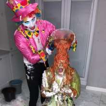 Which triggers the trap. I can't believe it I'm in shock and can't remove myself from the chair. The brainwashed clown appears smiling. I beg but the brainwashed clown pays no attention. The clown shows the camera the mess at times, laughing and jumping around before hitting me with it. I'm covered in the mess, despite me begging for mercy, I feel so Humiliated,