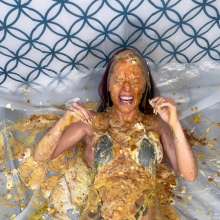 Victoria gets her skimpy one-piece bathing suit filled with condiments, beans, and soups! We set out a big bucket beneath her, and anything that spilled out of her swimsuit and into the bucket we poured directly onto her face!