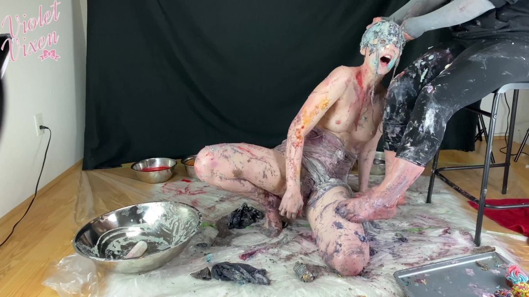 >Epic sploshing with bright purple, highly saturated gunge while she's allowed to frig and wank in front of Squishes and her friend.