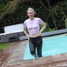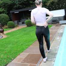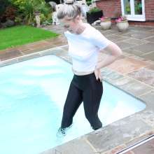 Mistress Splash wears a tight white t-shirt and shiny black leggings as she gets totally soaking wet in the pool and hottub. The t-shirt goes see-through and clings to her body as she soaks herself in the water.