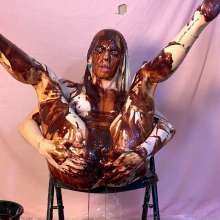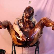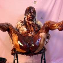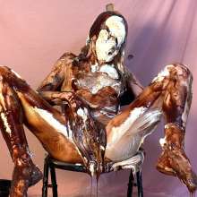So spreading the chocolate all over herself shes rubs her pert breasts and choco-clit with great vigour. The mess continues with some rather thick creamy cool whip pies to her face and pussy making her a unbelievable gooey mess. She then starts to play with herself rubbing her boobie doobies and fingering her fudge (to give us a treat). Before giving her booty a good blast as well.