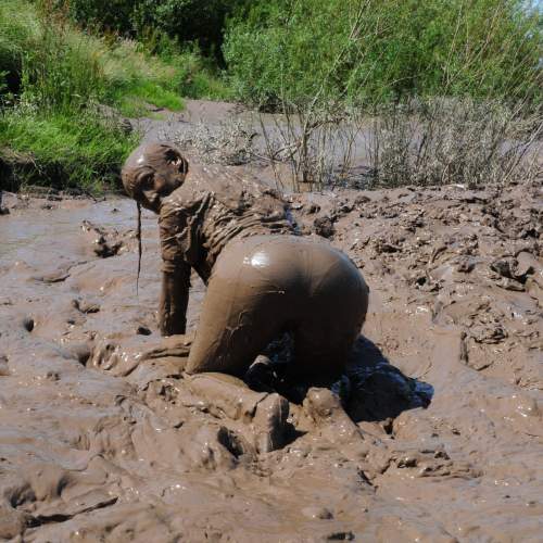 Next, Miee immerses herself in a tub filled with creamy lotion slime, completely drenching her stylish ensemble. Just when you think it can't get messier, she steps into a mud pan--where rich, reddish Moroccan clay stains her clothes in a way that's nearly impossible to clean. But Miee doesn't flinch.