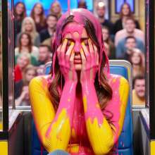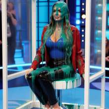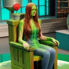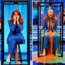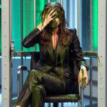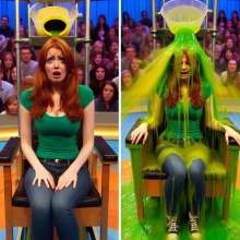 The gunge eeventually stops and a in disbelief sophie is left dripping running her hands thru her hair and looking embarassed.