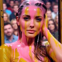 Katie cringed as a klaxon went of and a downpour of pink,yellow striped gunge poured out over her coverung her in gunge turning her into a fruit salad sweet.