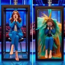 Sophie came down on stage and stephanie Strapped her in to the Liar Liar device.