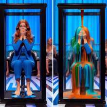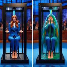 Lower the tank a tall glass door sized box lowered down around katie as host stephanie smirking look on