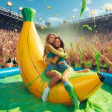 pair of swedish 21 y/o woman on an enormous inflatable banana in an inflatable pool hugging to celebrate winning 90's gameshown ,Photorealism , realistic , highly detailed , beaytiful , slime explosion covering everyone.
