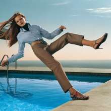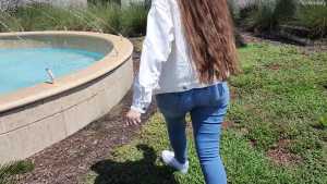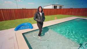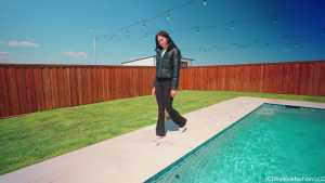 | Jenny is sitting by the pool, wearing black yoga pants, a white shirt, sneakers and a puffy leather jacket. She first walks around for a little bit, s... | |