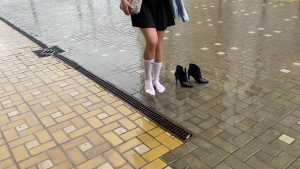 It was raining outside and there were a lot of puddles! So I decided to jump in the puddles in my heeled boots and then in my socks! |