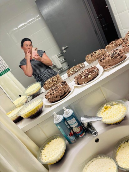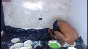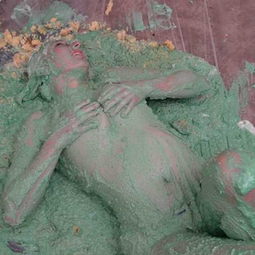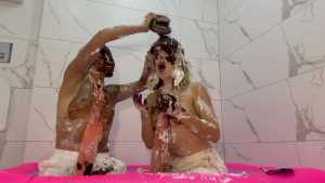 | We are surrounded by lots of big pies and decide to start grabbing handfuls and sensually rubbing them on each other, our swimwear starts to get cover... | |