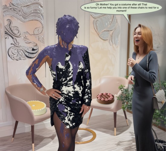 | Adonia is back, and messier than ever! This time she is wearing a sleek black velvet cocktail dress with dressy leather sandals. As you may recall, s... | |