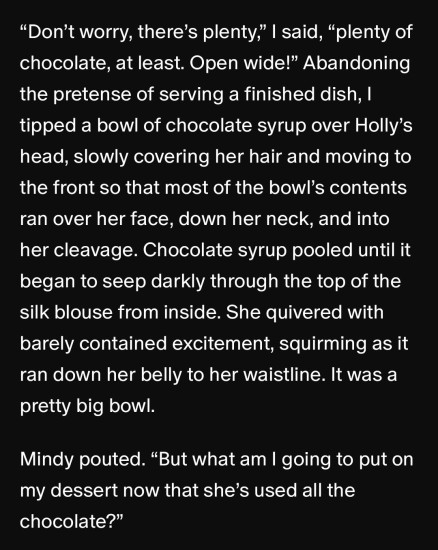 | Naked and ready for fun, I have bottles of thick black paint waiting just for me. As I pour each bottle of paint, and smear it over myself, the layers... | |