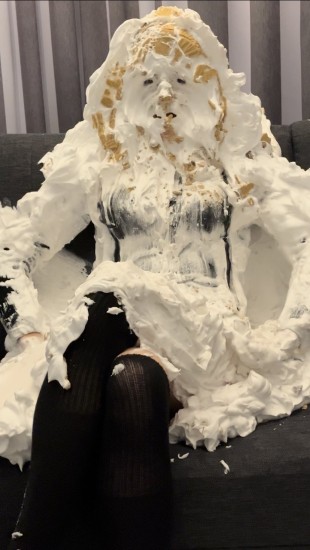 | She wears a white pantsuit. She is covered with jam and honey with it put on clothes. report | |