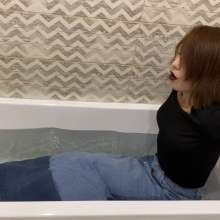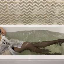 | Maya is taking a shower, wearing her elegant blue dress, tan stockings, and white pointy high-heeled shoes. report | |