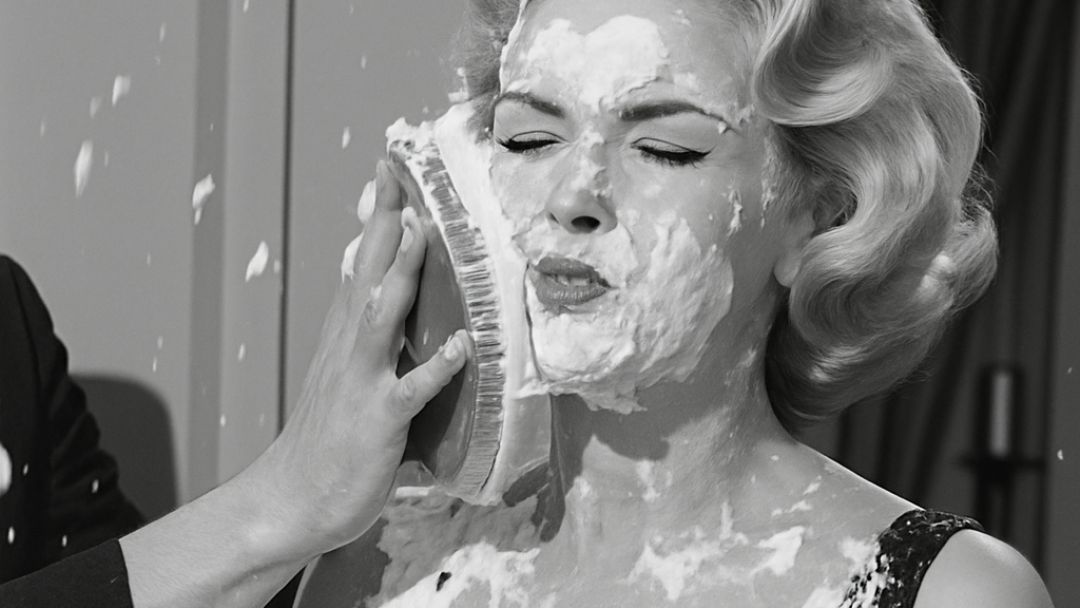 AI images created for a Stooges-inspired Substack notes, featuring women in dressy outfits getting pied.