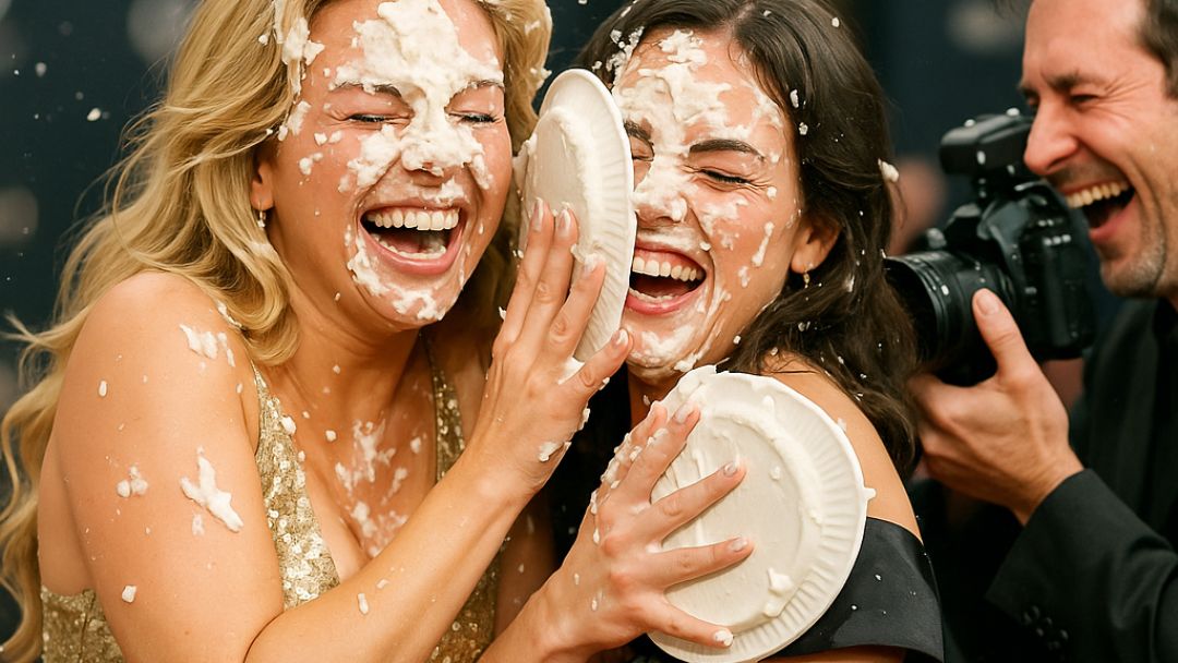 AI images created for a Substack post featuring two sets of women getting pied: one a famous bombshell, the other a quiet office worker.