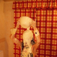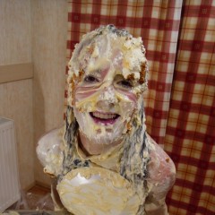 She then takes a bowl of cream and pours it over her head licking the cream as it runs over her face. Followed closely by a jug of custard over her face. Then come the pies and of course a pie sandwich!