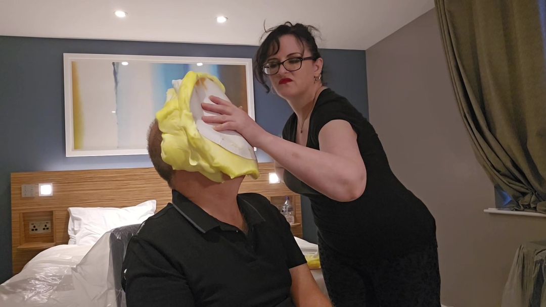 1) Flanman is in dominating mood for a change, waving his bare feet in front of the camera saying "in your face guys," "smell these." Caroline is unimpressed and decides to give him a custard pie in the face. 1min 50 secs
