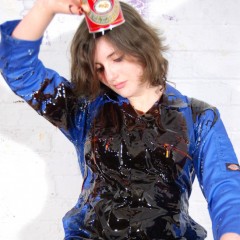 The gunging continues, as she steadily reduces herself to a wet and sticky mess, before she takes to the gunge-covered floor and writhes about in the pool of mixed milk, custard, treacle and syrup. She makes gunge angels on the floor, rolls onto her front, pressing her already drenched suit down into the gunge, and then rolls onto her back again, and relaxes, utterly drenched in mess.