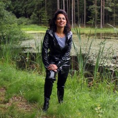 Samantha this time decided to walk to the pond dressed in shiny. Thigh high boots, shiny leggings and jacket made of vinyl. It looked like it would rain. Heavy clouds overhead and almost dark. Needless to say, it was therefore cold. Beautiful pond hidden in the woods was partially covered with green. Dark water level was in such contrast with the green that she decided to test the depth of the water in the pond. How it all happened, you'll see in this video.