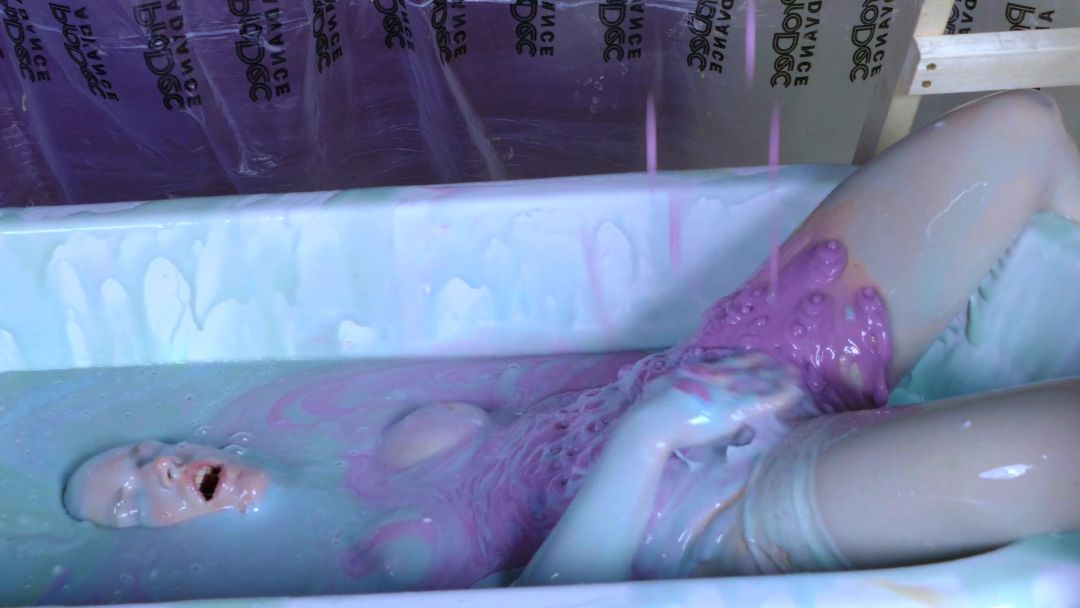 A third full pour of 60 litres is triggered onto her, and she fans her incredible hair out to let a wonderful pastel rainbow of gunge build up on it. She then slips out of her knickers and rolls around in the tub. "This feels so good" she gasps, "I just want to be covered in it". She positions her naked pussy under the gunge flow, and moans "I'm ready". More gunge floods down between her legs, and she starts bucking her hips and moaning. She can't resist this feeing for long, and as she submerges her head and face backwards into the gunge she uses her fingers to make herself cum.