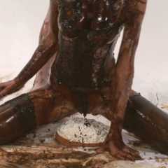 Now the girls strip off their tiny thongs. Lorna straddles a creamy pie, and Amber slowly pushes her down into it. We see Lorna's sweet pussy grind down into the pie, the creamy white filling contrasting beautifully with the dark treacle covering her skin. As Lorna rocks against the pie, they kiss again.