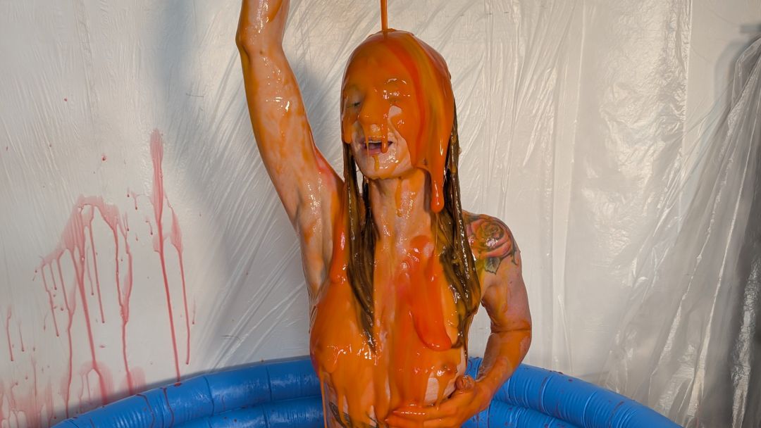 I've been invited to do a quiz! Round 1 is 5 questions and if I get 2 wrong I get a 10 litre bucket of gunge over my head, needless to say I got them wrong and get covered in red gunge! The quizzer lets me know he has to go and set up for round 2 so leaves me in the room by myself covered in this lovely thick, warm gunge! I begin to play with it and putting it all over my body, I get a bucket of orange gunge and pour it over myself whilst putting it into my bra and pants and pushing it out. After I'm completely naked I then get a bucket of yellow gunge and begin to rub my pussy, it feels so good! I empty out the rest of the bucket and cum using my fingers, luckily the quizzer didn't catch me!
