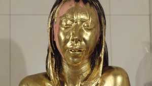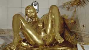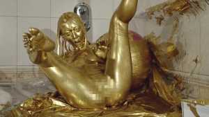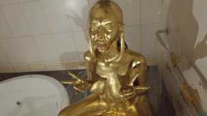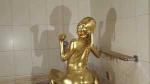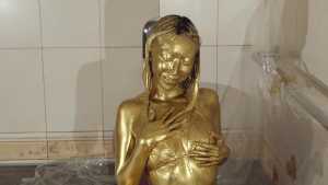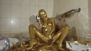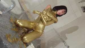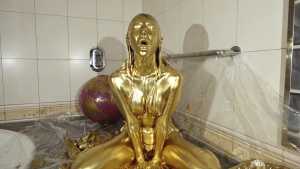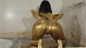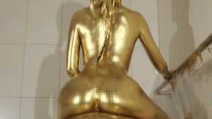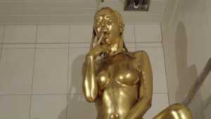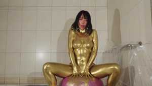 She's wearing a silver bikini, but today it will turn gold. Seeing the golden liquid for the first time, she seems nervous. From the moment she touches it, she enjoys the sensation. After covering her entire body with it, she immerses her face. Once she's become a golden statue, she takes it off and bounces sexily on a balance ball. It ends with her sharing her thoughts.