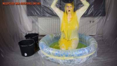 While she gives Bob the handjob, he continues to cover her with a lot of paint until the point that he cums hard over Cleo's big boobs.