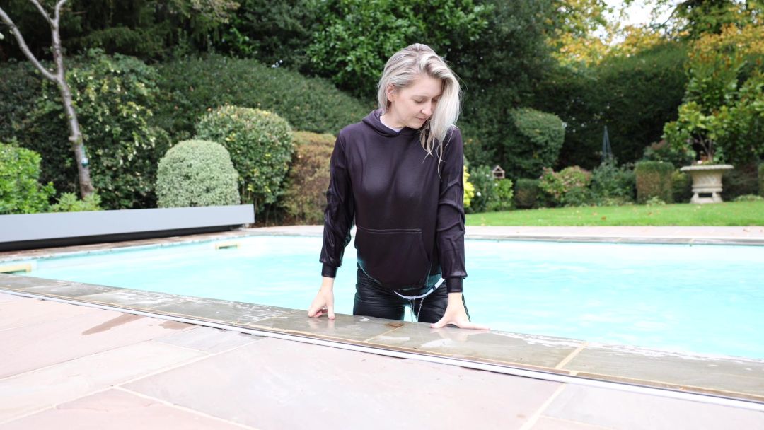 Mistress Splash wears a dark hoodie with a white t-shirt, dark jeans and white trainers are she jumps into the pool! After swimming and playing in the pool, she moves into the hottub where she takes off her hoodie revealing a see-through white t-shirt, with no bra. She soaks herself in the hottub before jumping back into the pool and playfully swims around teasing the camera. She emerges from the pool and poses for the camera before finishing the video back in the hot tub.