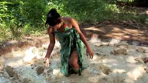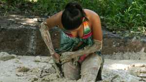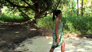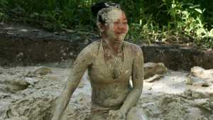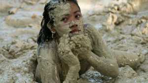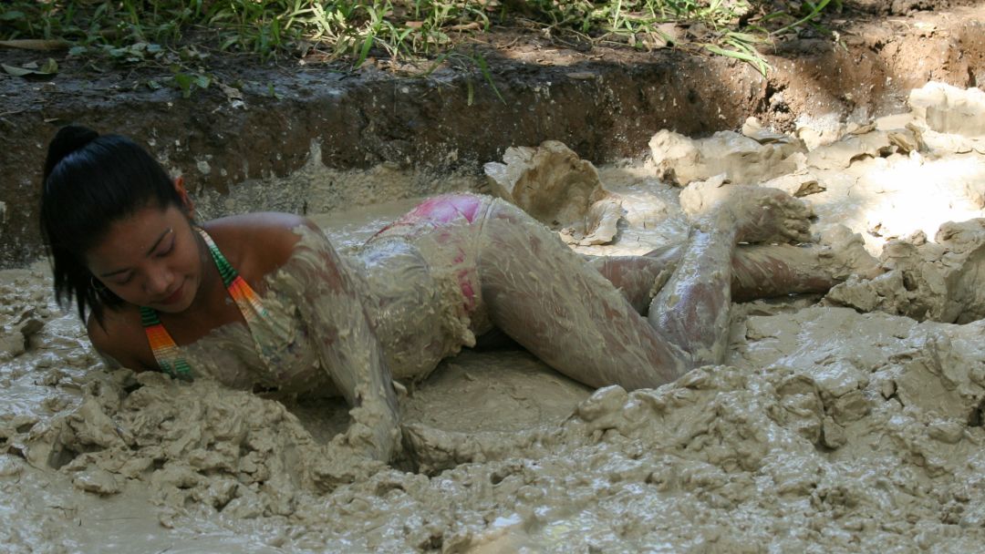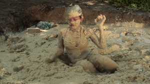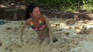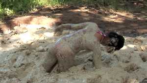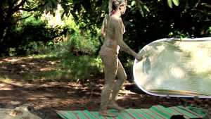 Andrea looks beautiful as she enters the scene wearing a colorful sarong. She starts putting her feet in the smooth clay and begins to walk around. The consistency of the clay results in loud squelching noises as she moves through it. Andrea teases us a bit (unconsciously?) by showing glimpses of her legs and bikini bottom. The sarong eventually comes off to reveal a vividly colored bikini. Andrea then proceeds to slowly cover her entire body with the smooth clay. A visual and audible feast put on by a shy, and yet willing, island beauty.