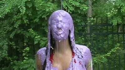 Our new model has great legs, a great smile... and doesn't "do" comedy. We can help! [Great pie hits with Michelle acting the stuck-up model. Also cleavage digging, eyes open under pie, green slime and hosedown!]