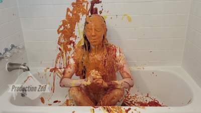 ""Not my face--Oh god oh god--Ewww" The scene starts off with Meg in the tub eagerly anticipating her savory initiation. She seems excited, that is, until the first shot of ketchup(?) splatters all over her white shirt at which point she whimpers and realizes what she's in for. Despite being slightly grossed out, Meg continues to giggle throughout the ridiculous of it all as she does oh so well. As the scene goes on, her partner proceeds to blast her with more sauces and condiments, gradually coating more and more of her outfit and hair while she prays that nothing splatters over her face. Unfortunately for her, and fortunately for us, Meg's last line of defense--her glasses, are removed and she is blasted with a saucy facial of god knows what. At this point, her infectious giggle is replaced by a dreadful frown as she is genuinely disgusted by it all. Although she clearly grossed out, she powers through it like an experienced wammer and takes more condiment blasts from her partner until his squirt gun runs out... but it doesn't stop there. At the end of the scene, some mess is scooped up into bowls and handed over to Meg so she can pour them over herself. She reluctantly obliges, but does so in a strategic manner to avoid covering face. As the final bowl is handed over her, Meg whimpers "Oh god, ew", but proceeds to prep talk her self into it. Then, for the finale, she takes a deep breath and pours the remaining slop straight over her head and face for our viewing pleasure. All in all, I definitely recommend this scene because Meg's reactions are incredible. She slowly transitions from the playful, giggly version of herself into the remorseful, disgusted one which we are not accustomed to seeing. Even though she is a little grossed out by the experience, she doesn't shy away from getting covered and that's what makes it enjoyable as a viewer. ![]() | |