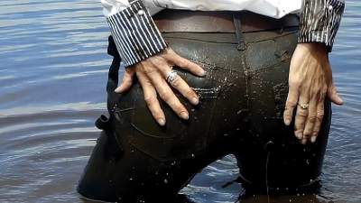 "Good dirty wader fun Another video from Andrea, this time wearing Aigle waders, tight jeans and a waterproof jacket. This time she has headed up to the moors, and wades in some boggy pools. Nicely, she doesn't flood the waders too quickly, though she definitely does flood them very thoroughly. She then takes off the waders, and plays in the boggy pool in the jeans and knee length socks she was wearing underneath. I prefer women to keep their boots on, myself, but that's a personal preference and yours may vary. She covers herself pretty thoroughly with pond algae (.I think; I wasn't matching it for the botany, and it's not really my subject) before washing off by immersing herself pretty much to the neck and then putting her (water filled) waders back on. It finishes up with a nice emptying shot, for good measure. ![]() | |