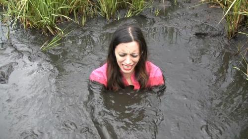Carver is searching the marsh for her pet dog who ran off while she was taking him for a walk. She is annoyed that she has to walk through the muddy marsh getting her white knee high boots all muddy. She takes a wrong step and her right leg sinks in soft mud almost to the top of her boot. She struggles for awhile annoyed but determined to get herself free. She finally is able to pull her leg out and she continues on to fine her pet. However the mud only gets deeper and she soon finds herself stuck up to her waist. She is upset but determined to get herself out. She struggles and pulls on the nearby marsh grass but can't seem to free herself. When it's clear that she is making no progress she starts to panic and cry thinking she will be stuck there forever. The video ends with her still stuck waist deep.