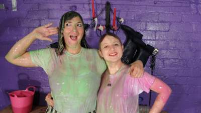 Technicals: Both videos are silent. Prudence cracks eggs and, later pours beans, over her head, and gets her hair fairly well covered, but keeps her face clear. The main focus of the scene is on dress filling and covering, which she does very thoroughly, she also gives her black leather boots a good coating of both eggs and beans. The hosedown video sees Prudence get completely drenched, including water down the inside of her dress front and back. Note the trailer is size reduced and heavily compressed for fast loading, the main videos are much higher quality.