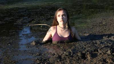 Skye forays into the swamp with a white shirt, jade blue unitard, and classic Reebok shoes. She takes off the shirt, wrapping it around her waist. The unitard is hugging her body, revealing her cameltoe. She proceeds onwards, and steps out into a grassy area by a pond and quickly sinks down into thick, deep mud. She wallows in it at first, tossing her shirt aside and pushing herself away from the bank, but as she sinks deeper her breathing becomes heavier. She sinks all the way up to her chin in the bog. You will love the texture of the mud: it is the exact same bog that Selene sank into in a previous season. The screen fades to black and then reveals Skye's extrication from the slimy muck.