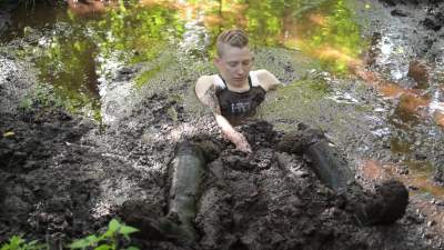 In this video I start off by playing in the shallow end of the peat pit, splashing in the mud until I slip and my boots fill with mud, pulling me deeper in. I manage to paddle back out to the edge, the sensation is too good and I need more. I grind into mud on the shore till I grab my vibrator and really get to work. Leaning back into the I play with myself until I need more. I get back out of the pit and jump back in, going under completely. I continue removing my cloths and playing till stratified... I then jump into a smaller mud pit and get stuck. I do get out but it left me exhausted.