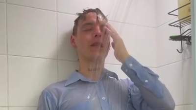 In the first file, Derek gets dirty with his white undershirt and then gets completely wet. He covers his face, hair, arms, undershirt, and the top of his pants with white suds. Then he rinses himself off completely with lots of water, getting himself all over wet. The effect of his wet white undershirt is spectacular. In the second file, he covers his boxers and chest with suds... and his blue boxers turn white!
