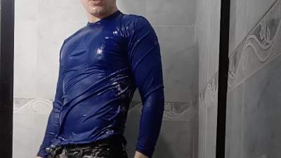 Matteo gets wet in his room wearing a white t-shirt and jeans. The wet effect on his t-shirt is immediately stunning, truly arousing. He'll get wet with three whole bottles, and after the third, he'll be completely wet. Super sexy!
