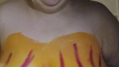 Here I am painting my breasts with Acrylic paints starting with Orange as the base, all over my 40DD breasts, then I start painting my nipples with pinky purple acrylic paint, then I try to paint lines connected from my nipples outwards, I play with them and have fun x