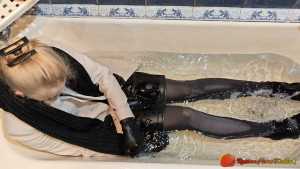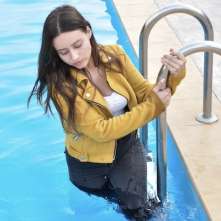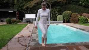 | Aurel takes off her leggings and her white sweater to play in pool. It's very sexy and the wet pantyhose look amazing. |