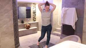 I'm getting wet in a hoodie and leggings! No underwear! And playing with my pussy with a shower head! Shower in my leggings!  report