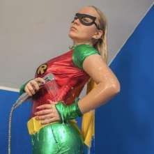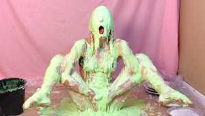 Jess is spray-painted green. Her body, breasts, and pussy are covered. She uses a dildo and insert her green pussy.  report