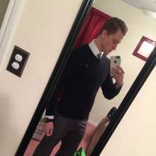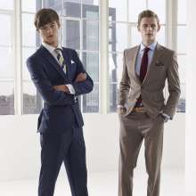 Said friends are Aaron and Bryan. Aaron is cute male with combed brown hair and light blue eyes. He currently has a nice blue suit jacket, white button up shirt, a blue and gold striped tie, maroon cuff links, blue slacks, black dress socks, and black dress shoes. Bryan is a handsome male with dirty blonde hair and light blue eyes like Aaron. He sports a light blue dress shirt, tan suit jacket, red tie, light brown belt, a watch, tan slacks, tan dress socks, and brown dress shoes.