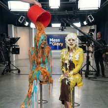Yana and Mira sit back on their stools only for Yana to sit in a large chocolate cake and Mira a lemon cream one!
