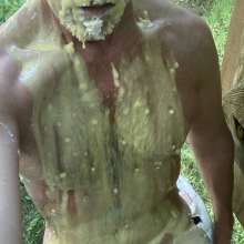 "Let me show you how I did it. I split the liquid into whole milk and cream, warmed butter, eggs and flour. I added them in one at a time, a little bit by a little bit over and over again", he tells me. He proceeds to pour melted butter over my chest, followed by heavy cream, flour, the milk and then he smashes two eggs on my pecs. He repeats it but now it is down my back. He does it two more times down my back and my chest.