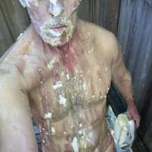 "Uuuhhhhmmmm...", he doesn't wait for me to finish. He dunks my head again, tells me it is passion fruit and pours it all over my chest and back. Then I feel something sticky pouring over me - "You can have raspberry, strawberry or blueberry glaze"